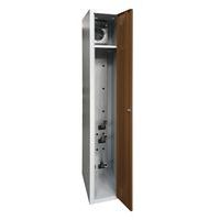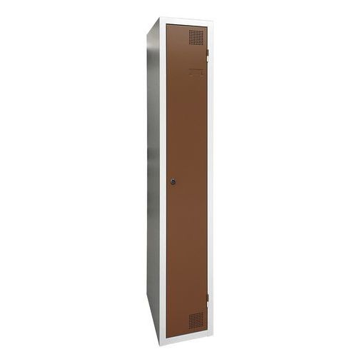 Droogkast met hete lucht, zeer robuust, met opbergvak en hangvakken. Behuizing en deur van elektroverzinkt plaatstaal, met verstevigd uiteinde over de gehele hoogte. Comfortabel in gebruik dankzij het scharniersysteem dat een openingshoek van 180° biedt. Hygiënisch met een dubbele ventilatieopening aan de voorkant, boven- en onderzijde van de garderobekast. Fraaie afwerking van epoxylak, verkrijgbaar in een ruim assortiment aantrekkelijke kleuren. 2 sluitingen naar keuze: sleutelslot of overval voor hangslot. Etikethouder op deur. Product gefabriceerd in Frankrijk.