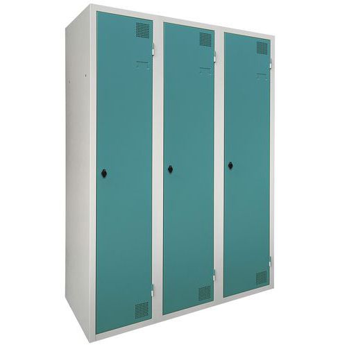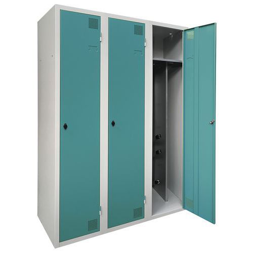 Droogkast met hete lucht, zeer robuust, met opbergvak en dubbel hangvak. Garderobe met dubbele compartimenten: voor het gescheiden opbergen van schone/vuile kleding. Behuizing en deur van elektroverzinkt plaatstaal, met verstevigd uiteinde over de gehele hoogte. Comfortabel in gebruik dankzij het scharniersysteem dat een openingshoek van 180° biedt. Hygiënisch met een dubbele ventilatieopening aan de voorkant, boven- en onderzijde van de garderobekast. Fraaie afwerking van epoxylak, verkrijgbaar in een ruim assortiment aantrekkelijke kleuren. 2 sluitingen naar keuze: sleutelslot of overval voor hangslot. Etikethouder op deur. Product gefabriceerd in Frankrijk.