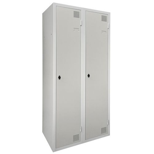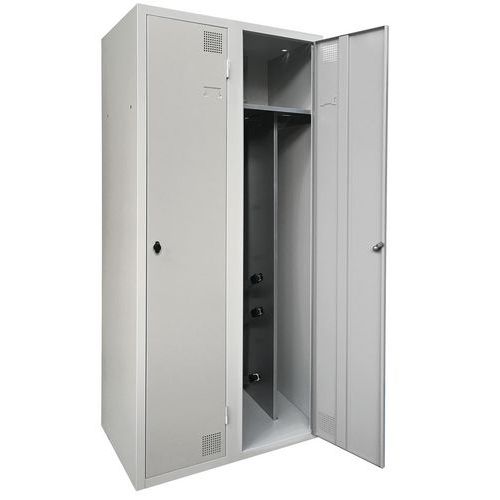 Droogkast met hete lucht, zeer robuust, met opbergvak en dubbel hangvak. Garderobe met dubbele compartimenten: voor het gescheiden opbergen van schone/vuile kleding. Behuizing en deur van elektroverzinkt plaatstaal, met verstevigd uiteinde over de gehele hoogte. Comfortabel in gebruik dankzij het scharniersysteem dat een openingshoek van 180° biedt. Hygiënisch met een dubbele ventilatieopening aan de voorkant, boven- en onderzijde van de garderobekast. Fraaie afwerking van epoxylak, verkrijgbaar in een ruim assortiment aantrekkelijke kleuren. 2 sluitingen naar keuze: sleutelslot of overval voor hangslot. Etikethouder op deur. Product gefabriceerd in Frankrijk.