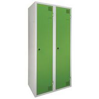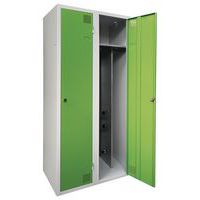 Droogkast met hete lucht, zeer robuust, met opbergvak en dubbel hangvak. Garderobe met dubbele compartimenten: voor het gescheiden opbergen van schone/vuile kleding. Behuizing en deur van elektroverzinkt plaatstaal, met verstevigd uiteinde over de gehele hoogte. Comfortabel in gebruik dankzij het scharniersysteem dat een openingshoek van 180° biedt. Hygiënisch met een dubbele ventilatieopening aan de voorkant, boven- en onderzijde van de garderobekast. Fraaie afwerking van epoxylak, verkrijgbaar in een ruim assortiment aantrekkelijke kleuren. 2 sluitingen naar keuze: sleutelslot of overval voor hangslot. Etikethouder op deur. Product gefabriceerd in Frankrijk.