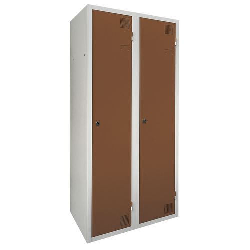 Droogkast met hete lucht, zeer robuust, met opbergvak en dubbel hangvak. Garderobe met dubbele compartimenten: voor het gescheiden opbergen van schone/vuile kleding. Behuizing en deur van elektroverzinkt plaatstaal, met verstevigd uiteinde over de gehele hoogte. Comfortabel in gebruik dankzij het scharniersysteem dat een openingshoek van 180° biedt. Hygiënisch met een dubbele ventilatieopening aan de voorkant, boven- en onderzijde van de garderobekast. Fraaie afwerking van epoxylak, verkrijgbaar in een ruim assortiment aantrekkelijke kleuren. 2 sluitingen naar keuze: sleutelslot of overval voor hangslot. Etikethouder op deur. Product gefabriceerd in Frankrijk.