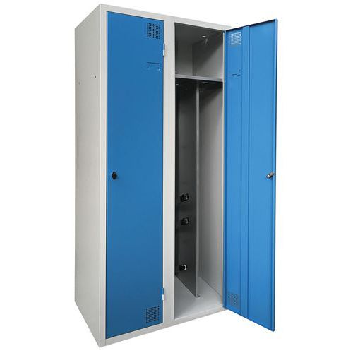 Droogkast met hete lucht, zeer robuust, met opbergvak en dubbel hangvak. Garderobe met dubbele compartimenten: voor het gescheiden opbergen van schone/vuile kleding. Behuizing en deur van elektroverzinkt plaatstaal, met verstevigd uiteinde over de gehele hoogte. Comfortabel in gebruik dankzij het scharniersysteem dat een openingshoek van 180° biedt. Hygiënisch met een dubbele ventilatieopening aan de voorkant, boven- en onderzijde van de garderobekast. Fraaie afwerking van epoxylak, verkrijgbaar in een ruim assortiment aantrekkelijke kleuren. 2 sluitingen naar keuze: sleutelslot of overval voor hangslot. Etikethouder op deur. Product gefabriceerd in Frankrijk.