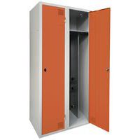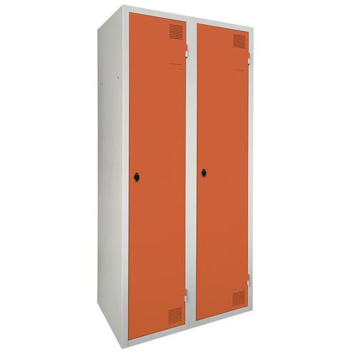 Droogkast met hete lucht, zeer robuust, met opbergvak en dubbel hangvak. Garderobe met dubbele compartimenten: voor het gescheiden opbergen van schone/vuile kleding. Behuizing en deur van elektroverzinkt plaatstaal, met verstevigd uiteinde over de gehele hoogte. Comfortabel in gebruik dankzij het scharniersysteem dat een openingshoek van 180° biedt. Hygiënisch met een dubbele ventilatieopening aan de voorkant, boven- en onderzijde van de garderobekast. Fraaie afwerking van epoxylak, verkrijgbaar in een ruim assortiment aantrekkelijke kleuren. 2 sluitingen naar keuze: sleutelslot of overval voor hangslot. Etikethouder op deur. Product gefabriceerd in Frankrijk.