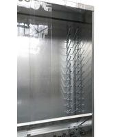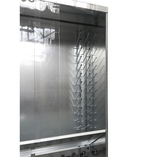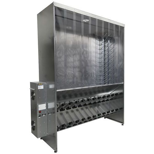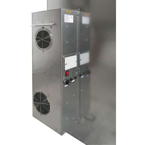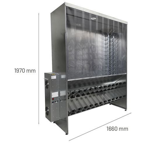 Stalen droogkast met een robuuste constructie en verzorgde afwerking met hete lucht. Groot bovenste vak met stalen stang, geschikt voor 7 tot 12 personen. Perfecte sluiting dankzij de goed isolerende deur met lamellen van PVC. Het onderste deel is uitgerust met 24 vaste aluminium stangen voor schoenen. Geoptimaliseerde droging: 2 ventilatiesystemen met hoge luchtdoorvoer (700 m3/h, 1600 W). Ideaal voor de bouwsector en openbare werken!