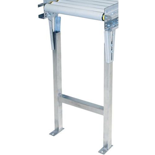 Dubbele steunvoeten voor transportband met rollen, aan de grond te bevestigen. Onmisbare accessoire voor de werking van de transportbanden met rollen van pvc of staal. In hoogte verstelbare dubbele steunvoeten om een helling van 5 tot 6% te creëren.