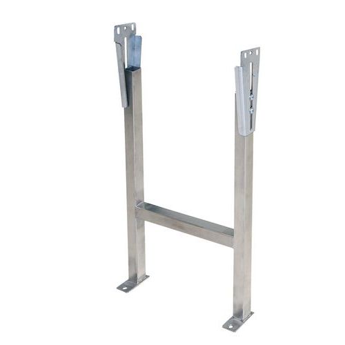 Dubbele steunvoeten voor transportband met rollen, aan de grond te bevestigen. Onmisbare accessoire voor de werking van de transportbanden met rollen van pvc of staal. In hoogte verstelbare dubbele steunvoeten om een helling van 5 tot 6% te creëren.