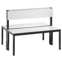 Dubbelzijdige garderobebank met rugleuning, stevige constructie, met of zonder schoenenrek, afhankelijk van het model. Fraaie afwerking met massief hout: dubbelzijdige zitting en rugleuning HPL, zeer vochtbestendig. Bank met poten met beschermende steldoppen, perfect in hoogte verstelbaar (10 mm). Stalen buisconstructie, doorsnede 30 x 30 mm. Zitting met HPL-bekleding, dikte 13 mm. Model met schoenenrek: frame door elektrolyse verzinkt. Gemaakt in Duitsland