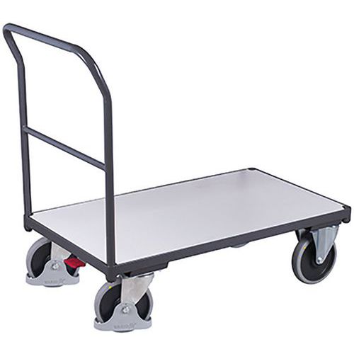 ESD Duwwagen Hoogte dwarsbuis duwbeugel: 335 mm (van bovenkant laadvlak) Uitvoering: * laadvlak van decorspaanplaat, lichtgrijs, electrisch geleidend Kleur: RAL 7024 grafietgrijs, electrisch geleidend, gepoedercoat Wielset: Bandage van electrisch geleidend elastisch rubber op kunststof velg met precisie kogellager, grijs, 2 zwenkwielen met centrale EasySTOP rem en 2 bokwielen, zwenkwielen met voetbeschermer