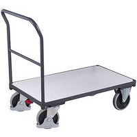 ESD Duwwagen Hoogte dwarsbuis duwbeugel: 335 mm (van bovenkant laadvlak) Uitvoering: * laadvlak van decorspaanplaat, lichtgrijs, electrisch geleidend Kleur: RAL 7024 grafietgrijs, electrisch geleidend, gepoedercoat Wielset: Bandage van electrisch geleidend elastisch rubber op kunststof velg met precisie kogellager, grijs, 2 zwenkwielen met centrale EasySTOP rem en 2 bokwielen, zwenkwielen met voetbeschermer Gemaakt in de EU Max. belasting (kg) : 500 kg