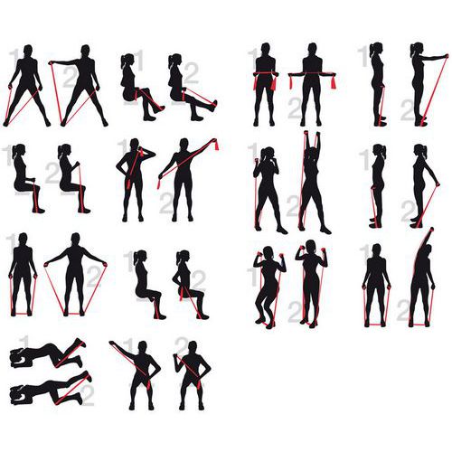 Wordt geleverd met een blad met 14 oefeningen die u met de band kunt doen.