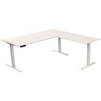 Elektrisch bureau met retour rechts. Gemelamineerd blad met een dikte van 19 mm. T-vormig onderstel. In hoogte verstelbaar van 72 tot 120 cm.
