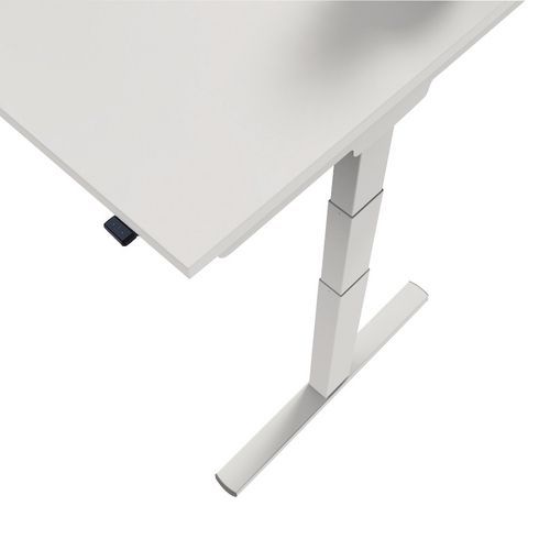 Ergonomisch zit-stabureau met T-vormig onderstel. Systeem voor elektrische hoogteafstelling met toets zonder geheugen. Elektrische schakelaar geïnstalleerd aan de rechterkant. Verstel uw bureau omhoog of omlaag en pas uw houding gedurende de dag aan