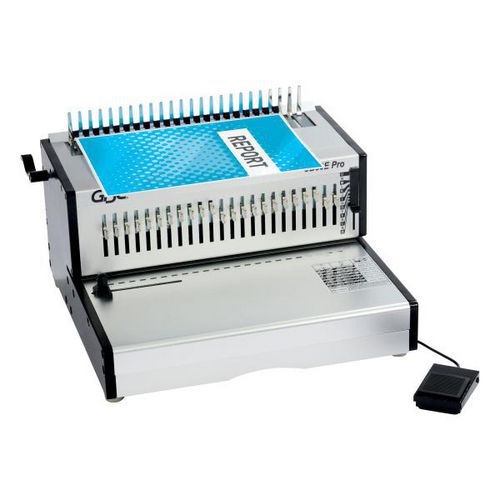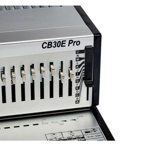 Inbindmachine Combbind CB30E Pro, voor het moeiteloos perforeren van maximaal 25 vellen, dankzij de elektromotor. Voor het inbinden tot 500 vellen met een bindrug van 51 mm, ideaal voor dikke dossiers en professionele presentaties. Comfortabel te gebruiken met een pedaal, om uw handen vrij te houden en uw productiviteit te verhogen. Pons-bindmachine met verstelbare ponspinnen en instelbare margediepte, voor een afwerking op maat, ongeacht het formaat. Robuust en praktisch, voorzien van een metalen behuizing, een grote opvangbak voor snippers, en een horizontale invoer.