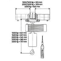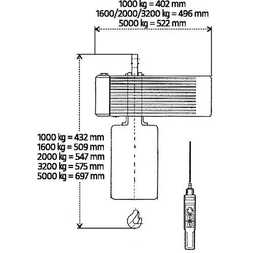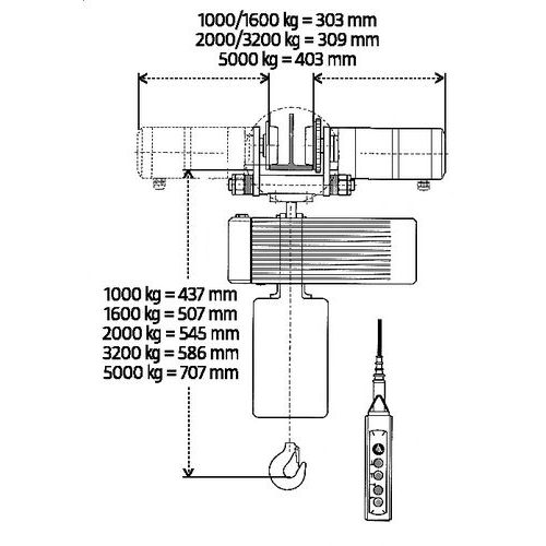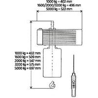 Standaard: bedieningsapparatuur op zeer lage spanning (TBT 48 V), noodstop, 3 m hefhoogte met haak, kettingbak, bedieningspaneel met 1,8 m kabel.