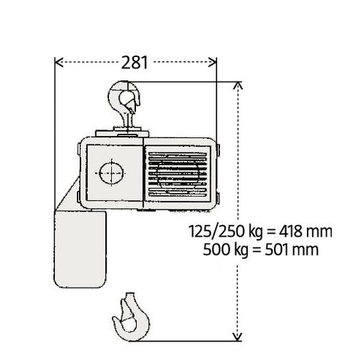 Standaard: bedieningsapparatuur op zeer lage spanning (TBT 48 V), noodstop, 3 m hefhoogte met haak, kettingbak, bedieningspaneel met 1,8 m kabel.