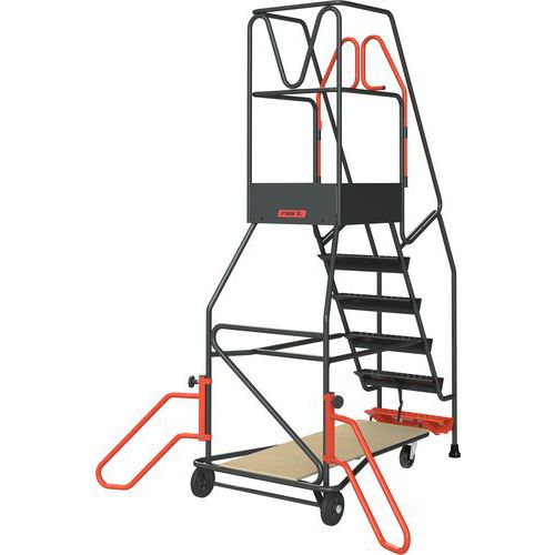 Verrijdbare stellingtrap met automatische blokkering voor extra veiligheid en een optimale ergonomie. Van mechanisch gelast staal met zelfdragende antisliptreden en bovenste plateau van verstevigd antislipplaatstaal. Hoge veiligheid van de gebruiker dankzij het hekje op het bovenste plateau dat slechts in 1 richting opent. Breed plateau op het onderste niveau van gevernist stevig hout, te gebruiken als opbergruimte. Perfecte stabiliteit: verstelbare stabilisatoren en mechanisch gelaste relingen aan 2 kanten.
