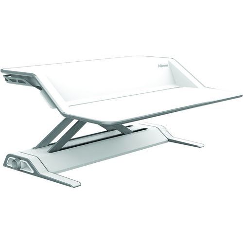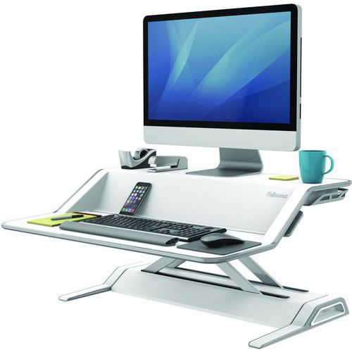 Ergonomisch zit-sta platform met twee werkoppervlakken met bruikbare ruimte voor al uw kantooraccessoires