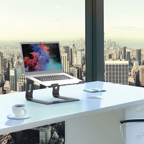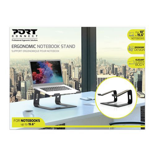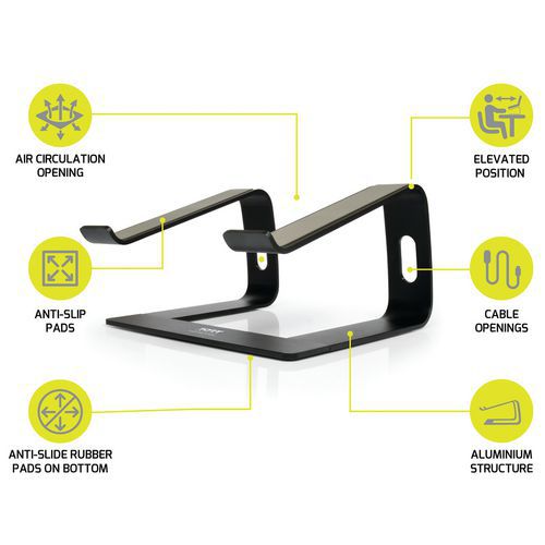 Ergonomische aluminium houder, speciaal voor notebook met open constructie voor ventilatie. Hogere stand op ooghoogte, ter preventie van nek- en rugklachten. Ergonomisch ontwerp met kabeldoorgangen om uw werkruimte te optimaliseren. Veiligheidshaken en antislipvoeten om te voorkomen dat het apparaat valt. De behuizing is volledig van aluminium en siliconen en biedt maximale stevigheid. Houder met volledig verwijderbare structuur voor eenvoudige montage.
