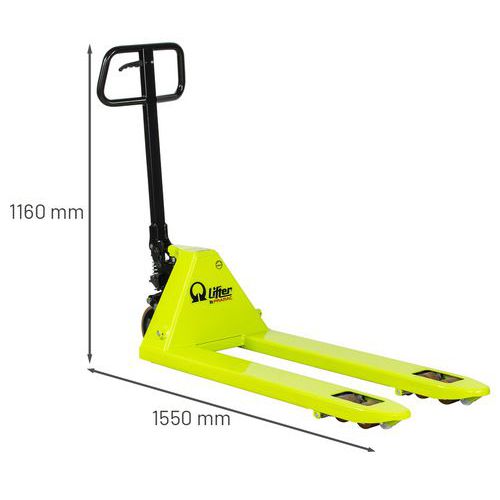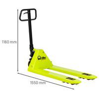 | Productnaam | Ergonomische handpalletwagen, Max. belasting: 2500 kg, Lengte vork: 1150 mm, Stuurwiel materiaal: Rubber |