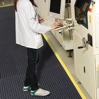 - Modulaire antivermoeidheidsmat, statisch-dissipatief, in de vorm van zeer robuuste rubberen antisliptegels. Noppenmotief voor maximaal antivermoeidheidscomfort in een droge industriële omgeving. De tegels zijn eenvoudig te hanteren, installeren en monteren, en ideaal voor het bedekken van grote oppervlakken. Met behulp van de voorgesneden vakken onder de mat kunnen snel een eenvoudig gepersonaliseerde oppervlakken worden gevormd. Oplossing met randen, voor hoekconfiguraties binnen of buiten, met valbeveiliging.
