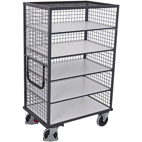 ESD etagewagen gelast Laadhoogte: 295 mm Hoogte duwbeugel: 1.040 mm Uitvoering: * trek- en duwbeugel met zachte zwarte kunststof bekleding * kopse wanden, wanden lengterichting en dak van draadgaas, maaswijdte: 50 x 50 x 4 mm * incl. 1 vaste en 4 verstelbare inlegbodems, variabel inzetbaar in stappen van 50 mm, draagvermogen per etagebodem: 80 kg * bodem en inlegbodems van 15 mm sterke decorspaanplaat, lichtgrijs, electrisch geleidend * etagebodems ingelegd in hoekstaal frame Kleur: RAL 7024 grafietgrijs, electrisch geleidend, gepoedercoat Wielset: Bandage van electrisch geleidend elastisch rubber op kunststof velg met precisie kogellager, grijs, diameter 200 mm, 2 zwenkwielen met centrale EasySTOP rem en 2 bokwielen, zwenkwielen met voetbeschermer Draagvermogen: 500 kg