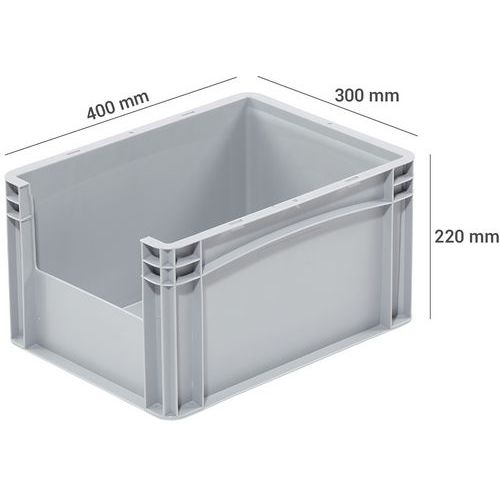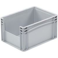 | Productnaam | Euronorm-bak met opening aan de voorkant, Totale inhoud: 21 L, Stapelbaar: ja, Totale hoogte: 220 mm |