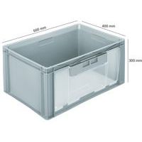 | Productnaam | Euronorm-bak met opening, Totale inhoud: 56 L, Stapelbaar: ja, Totale hoogte: 300 mm, Totale breedte: 400 mm |