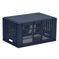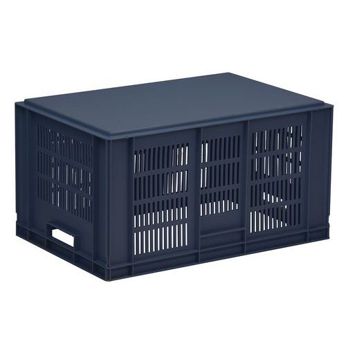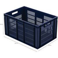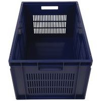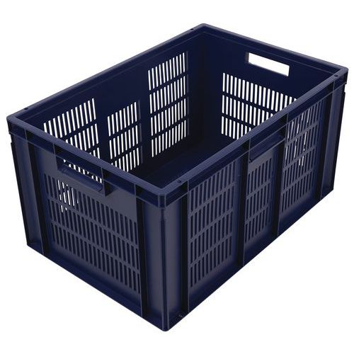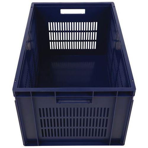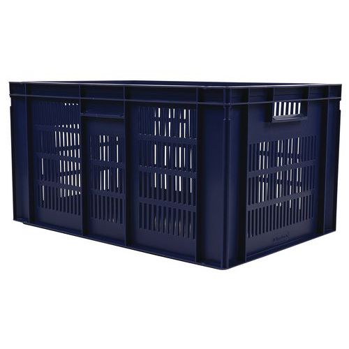 Euronormbak, blauw, met grote stabiliteit bij het stapelen. Goede ventilatie dankzij de open wanden. Eenvoudig in gebruik dankzij de brede open handgrepen. Bestand tegen oliën, vetten en tal van chemische producten.