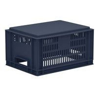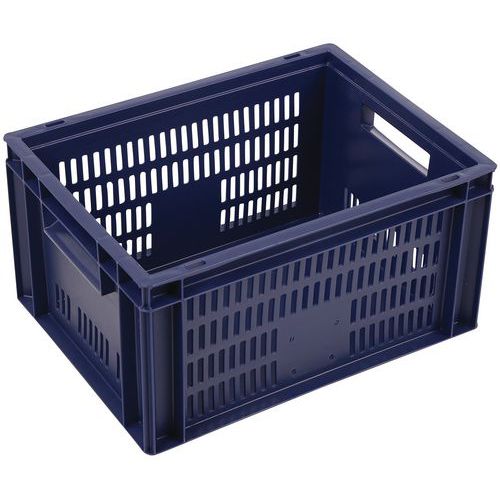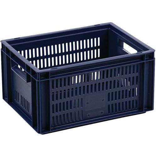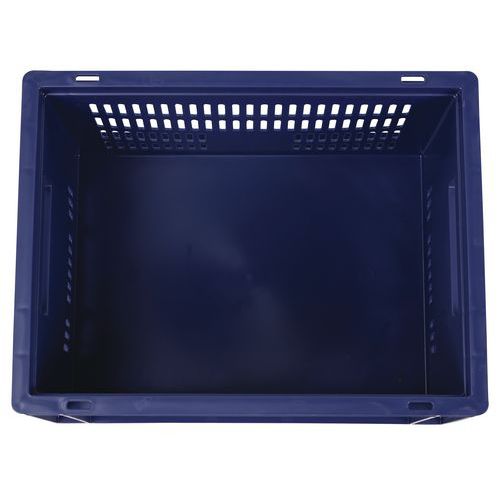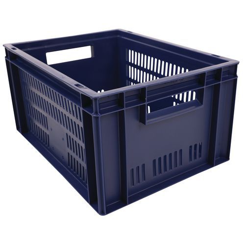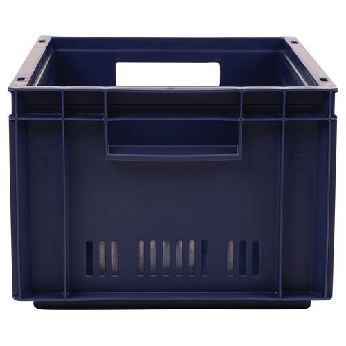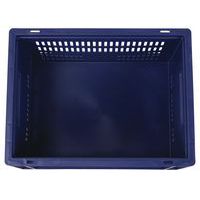 Euronormbak, blauw, met grote stabiliteit bij het stapelen. Goede ventilatie dankzij de open wanden. Eenvoudig in gebruik dankzij de brede open handgrepen. Bestand tegen oliën, vetten en tal van chemische producten.