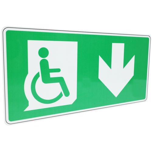 Specifiek verplicht signaalbord voor openbare gebouwen. Voor veilig houden van personen met verminderde mobiliteit in geval van evacuatie. Aanduiding voor evacuatie die aangeeft dat de nooduitgang voor personen met een handicap zich onder het bord bevindt. Robuust en stevig dankzij de sandwichconstructie. Roestvast en schimmelwerend.