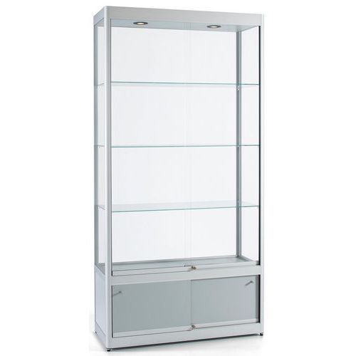 Expositievitrine met opbergruimte, snel operationeel. Vitrine met een robuuste en stevige constructie. Hoogwaardig gehard veiligheidsglas (wanden, deuren en legborden). 2 schuifdeuren met veiligheidsslot. 3 in hoogte verstelbare en verwijderbare legborden met een draagvermogen van maximaal 10 kg per stuk.