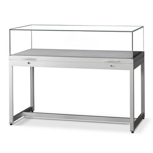 Tafelvitrine op poten, snel operationeel. Hoogwaardige stolp van gehard glas, 8 mm dik. Onderstel met een robuuste en stevige constructie. Opening met verborgen gasveren. 2 veiligheidssloten en handgrepen.