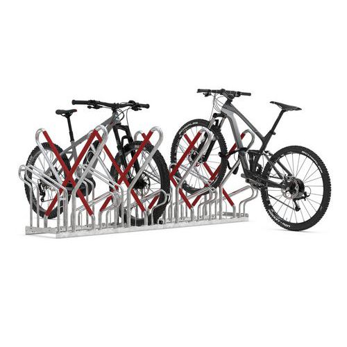 Enkel- of dubbelzijdig fietsenrek met robuuste constructie van stalen buizen en corrosiebescherming door galvanisatie. Neemt weinig ruimte in beslag dankzij de afwisselend geplaatste hoge en de lage beugels. Ruimte tussen de beugels voor fietsen met een bandenbreedte tot 55 mm. Ruimte tussen de wielen: 500 mm. Voorzien van een verbeterde diefstalbeveiliging doordat het frame kan worden vergrendeld op de geïntegreerde stalen beugel met oogje. Rode schokbescherming.