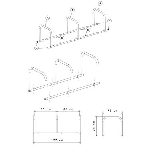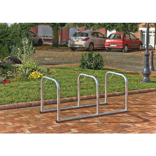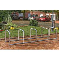 | Productnaam | Fietsenrek met beugel, Totale lengte: 1770 mm, Aantal plaatsen: 6, Materiaal: Staal, Coating: Gegalvaniseerd |
