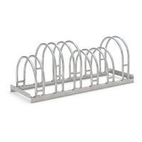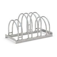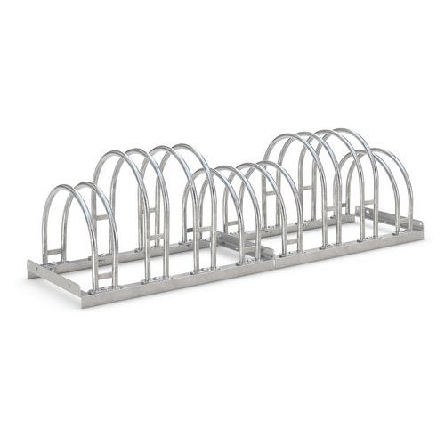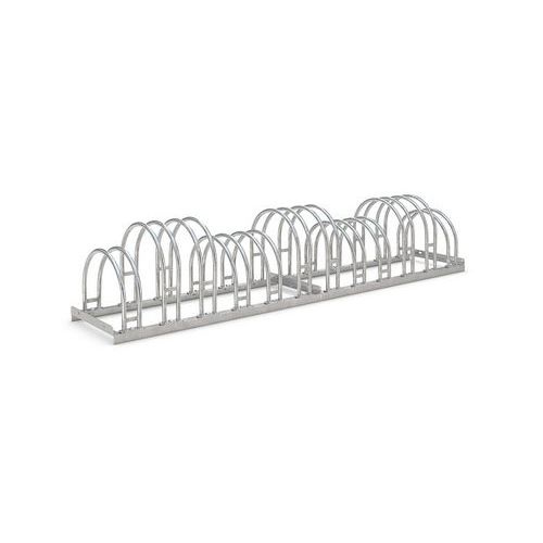 Robuust ontwerp van staal, beschermd tegen corrosie door boogvormige beschermbeugels. Biedt veel ruimte in een beperkte ruimte. Overal te gebruiken waar fietsen snel worden geparkeerd: voor winkels, kantoren, enz. De verankeringen in de vloer en de montagesteunen worden afzonderlijk verkocht.