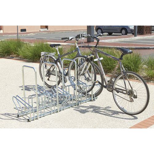 Fietsenrek met eenvoudige bevestiging aan de grond. De fiets staat stabiel. Vereenvoudigt het opruimen van fietsen. Model Hollande met plaatsing tegenover elkaar met beugels voor antidiefstalsysteem. Gemaakt in de EU