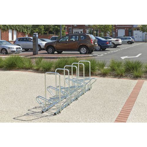 Fietsenrek met eenvoudige bevestiging aan de grond. De fiets staat stabiel. Vereenvoudigt het opruimen van fietsen. Model Hollande met plaatsing tegenover elkaar met beugels voor antidiefstalsysteem. Gemaakt in de EU