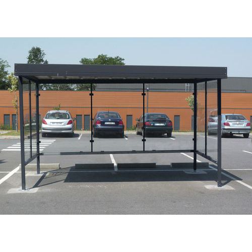 Plat dak van staalplaat Discreet geïntegreerd in het landschap Regenwateropvang Modellen met of zonder tweewielersteun Constructie Frame van verzinkt stalen buizen Kolommen, dwarsliggers, langsbalken: 60 x 60 x 2 mm Dakgoten voor regenwaterafvoer geïntegreerd in de kolommen Verstelbare voetplaten: 200 x 200 x 5 mm Bevestigingsmateriaal van roestvrij staal, klasse A2 Dakbedekking Dakplaat: Haciero 3.333.39T Afwerking Uithardende polyesterverf, gebakken op 200°C, UV-bestendig Bekleding Gehard helder glas (Sécurit), dikte 5 mm Bekleding van voorgelakte Hacierba 11.1000.8B staalplaat Bevestiging niet meegeleverd: Gebruik M12/65 ankerbouten op een betonnen plaat of betonnen voetstukken Gebruik M12/120 draadeinden op een schone en vlakke asfaltlaag. De asfaltlaag moet minimaal 7 cm dik zijn. Gemaakt in de EU Klantgarantie : 10 jaar