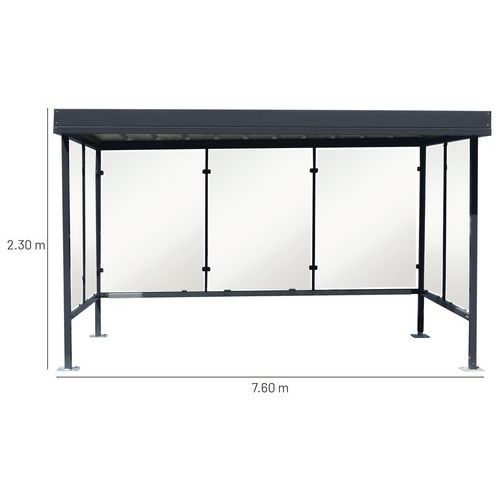 Plat dak van staalplaat Discreet geïntegreerd in het landschap Regenwateropvang Modellen met of zonder tweewielersteun Constructie Frame van verzinkt stalen buizen Kolommen, dwarsliggers, langsbalken: 60 x 60 x 2 mm Dakgoten voor regenwaterafvoer geïntegreerd in de kolommen Verstelbare voetplaten: 200 x 200 x 5 mm Bevestigingsmateriaal van roestvrij staal, klasse A2 Dakbedekking Dakplaat: Haciero 3.333.39T Afwerking Uithardende polyesterverf, gebakken op 200°C, UV-bestendig Bekleding Gehard helder glas (Sécurit), dikte 5 mm Bekleding van voorgelakte Hacierba 11.1000.8B staalplaat Bevestiging niet meegeleverd: Gebruik M12/65 ankerbouten op een betonnen plaat of betonnen voetstukken Gebruik M12/120 draadeinden op een schone en vlakke asfaltlaag. De asfaltlaag moet minimaal 7 cm dik zijn. Gemaakt in de EU Klantgarantie : 10 jaar