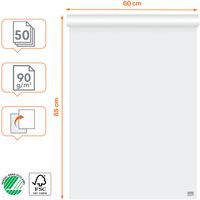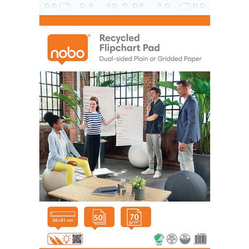 Dubbelzijdig te gebruiken blanco of geruit 90 grams papier met een stevige headercard voor eenvoudig gebruik. Rastergrootte 50 mm. Het papier van hoge kwaliteit heeft een perforatierand aan de bovenkant en is voorgeperforeerd met 15 gaten zodat het op de meeste flipovers past. Papier afkomstig uit verantwoord beheerde Europese bossen. Gemaakt van 95% gerecycled papier, 100% recyclebaar en Nordic Swan gecertificeerd. Het papier is verouderingsbestendig, waardoor het langer schoon en wit blijft en bedrukt met oplosmiddelvrije inkt op waterbasis. 50 vel. Pak van 1, op rol, plasticvrije verpakking.