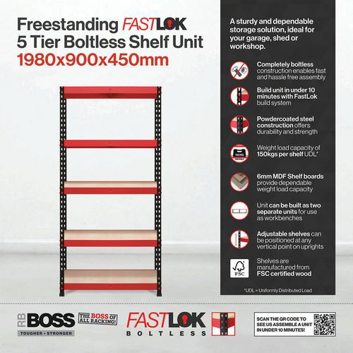 Het volledig boutloze Fastlok-ontwerp is ideaal voor snelle en probleemloze montage. Deze vrijstaande stelling kan in minder dan 10 minuten worden gemonteerd.