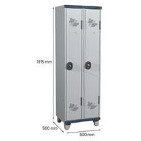 Garderobekast van hoogwaardig plaatstaal, zeer stevig, vormvast. Gevormd plaatstaal 6/1e (conform standaarddoorbuiging 8/1e). Aan elkaar gelaste kolommen voor meer stevigheid. Uitstekende mechanische weerstand met gesloten klemprofiel. Deur onwrikbaar in open en gesloten stand, breukbestendig. Scharniert open tot 18°. Garderobekast met etikethouder. Combineer stevigheid, veiligheid en fraaie vormgeving voor uw collectieve ruimtes!