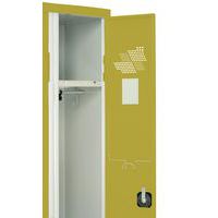 Garderobekast van hoogwaardig plaatstaal, zeer stevig, vormvast. Gevormd plaatstaal 6/1e (conform standaarddoorbuiging 8/1e). Aan elkaar gelaste kolommen voor meer stevigheid. Uitstekende mechanische weerstand met gesloten klemprofiel. Deur onwrikbaar in open en gesloten stand, breukbestendig. Scharniert open tot 18°. Garderobekast met etikethouder. Combineer stevigheid, veiligheid en fraaie vormgeving voor uw collectieve ruimtes!