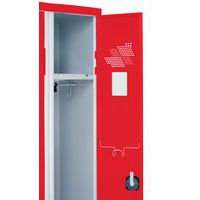 Garderobekast van hoogwaardig plaatstaal, zeer stevig, vormvast. Gevormd plaatstaal 6/1e (conform standaarddoorbuiging 8/1e). Aan elkaar gelaste kolommen voor meer stevigheid. Uitstekende mechanische weerstand met gesloten klemprofiel. Deur onwrikbaar in open en gesloten stand, breukbestendig. Scharniert open tot 18°. Garderobekast met etikethouder. Combineer stevigheid, veiligheid en fraaie vormgeving voor uw collectieve ruimtes!