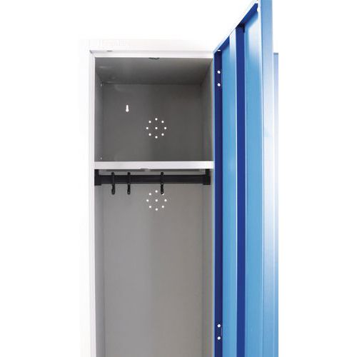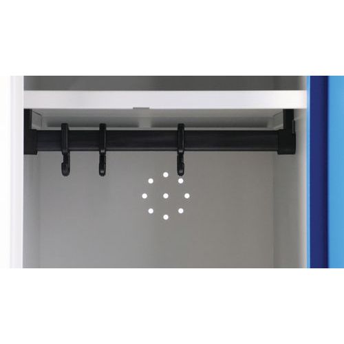 Kast met geluidloze deur vanwege de kunststofnoppen. Vak met hangstang, voorzien van accessoires. Met afgeronde hoeken voor optimale veiligheid. Hygiënisch: ventilatieopening in de achterwand. Veiligheidstips: - Plaats het meubel op een vlak oppervlak - Bevestig het aan de muur of een scheidingswand met een speciale bevestiging - Let erop dat u de aanbevolen maximale belasting niet overschrijdt en zorg voor een goede verdeling Plaatstaal dikte : 7/10de Klantgarantie : 10 jaar