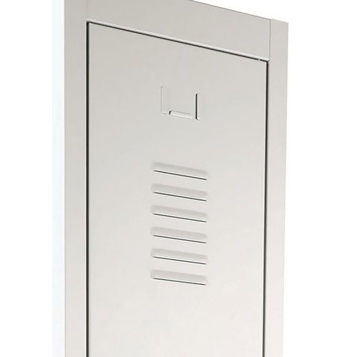 Robuuste magazijngarderobekast, speciaal voor schone industrie, volledig plat en gedemonteerd geleverd. Duurzame constructie van metaal met gelakte afwerking en coating van elektrostatisch poeder. Verstevigde deur met onzichtbare scharnieren, geluidsdempend met kunststof stempel. Deur met dubbel ventilatierooster en etikethouder. Garderobekast comfortabel in gebruik met grote opening van 115°.
