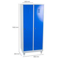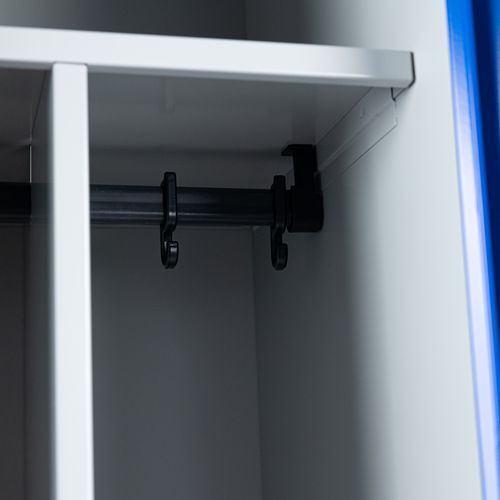Garderobekast op poten geschikt voor zware industrie, met verstevigde deuren. Optimale opening van 180°, esthetisch met onzichtbare scharnieren. Hangkast met scheiding voor schone en vuile kleding. Perforaties voor wandbevestiging, met etikettenhouder. Hygiënisch dankzij ventilatie boven-/onderaan de deuren.