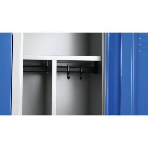 Garderobekast op poten geschikt voor zware industrie, met verstevigde deuren. Optimale opening van 180°, esthetisch met onzichtbare scharnieren. Hangkast met scheiding voor schone en vuile kleding. Perforaties voor wandbevestiging, met etikettenhouder. Hygiënisch dankzij ventilatie boven-/onderaan de deuren.