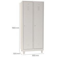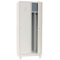 Garderobekast op poten geschikt voor zware industrie, met verstevigde deuren. Optimale opening van 180°, esthetisch met onzichtbare scharnieren. Hangkast met scheiding voor schone en vuile kleding. Perforaties voor wandbevestiging, met etikettenhouder. Hygiënisch dankzij ventilatie boven-/onderaan de deuren.