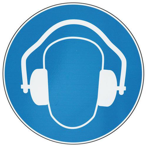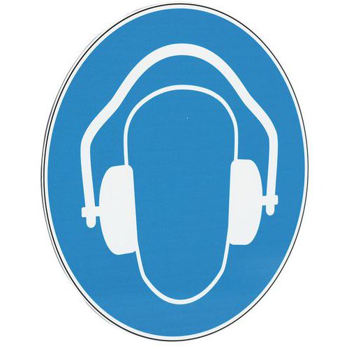 - Bord met pictogram dat voor iedereen begrijpelijk is: Dragen van gehoorbescherming is verplicht.